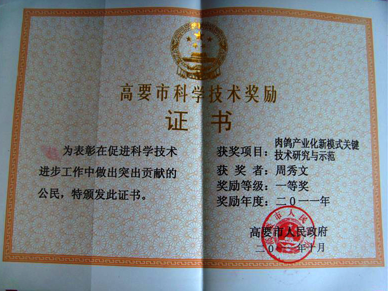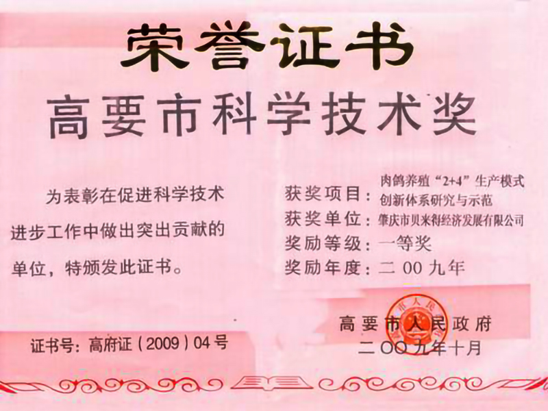 高要市科学技术奖证书