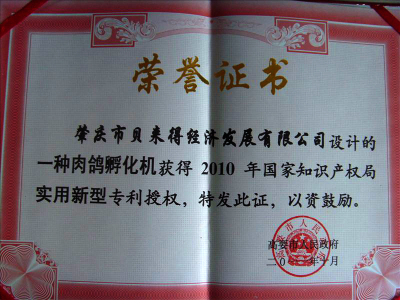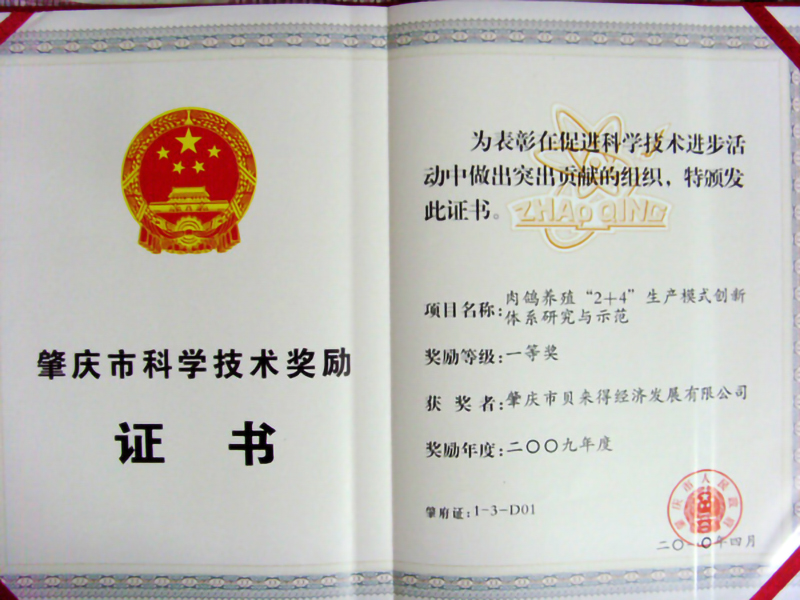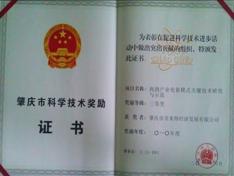 肇庆市科学技术奖励证书