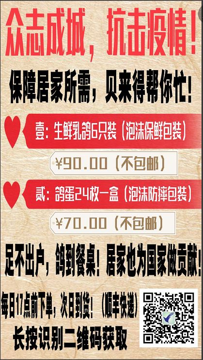 通告如下: 一、从本月23日起乳鸽规格调为每箱6只,取消原每箱3只的包装。 二、活动将持续至中央宣布疫情解除为止。单价不变,90元/箱/6只。 三、商城除上述乳鸽包装和价格有所变动外,其它标示不变,仍可下单。