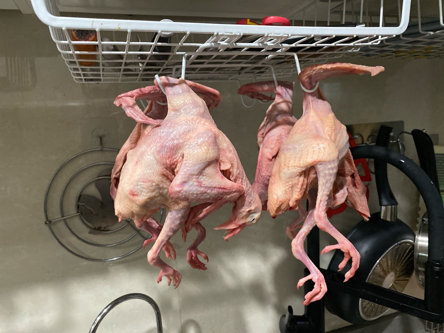 1、乳鸽洗干净吊起沥水。