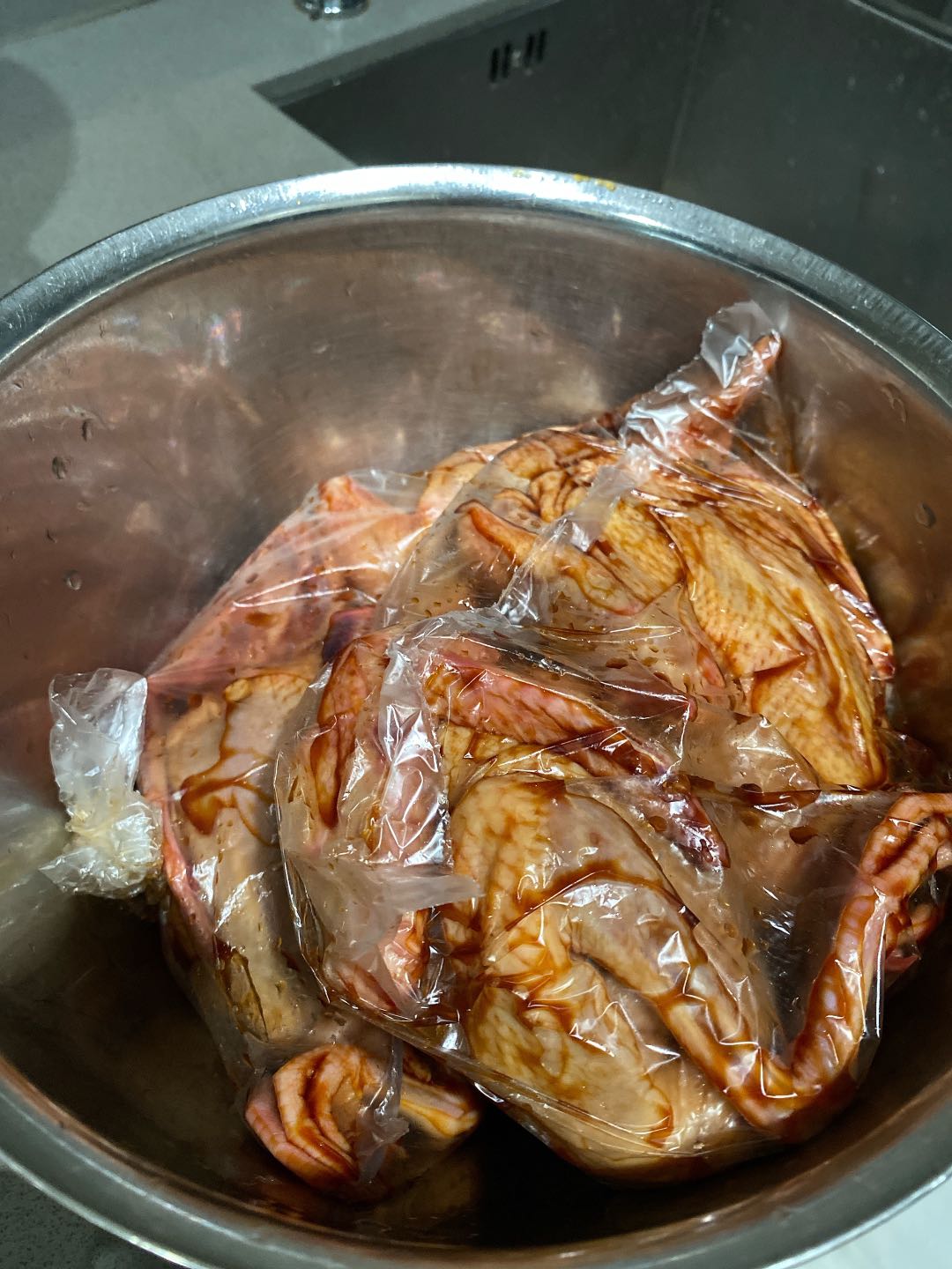 把乳鸽和腌料装进保鲜袋里面腌制2-3小时(不用保鲜袋的话可以中途翻转一下,使之更入味)。