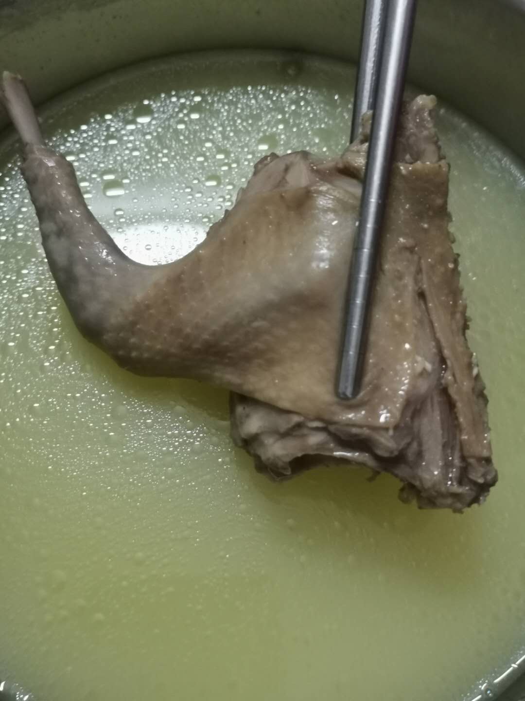 3、用勺子把滚油淋上鸽身,直至熟透即可。