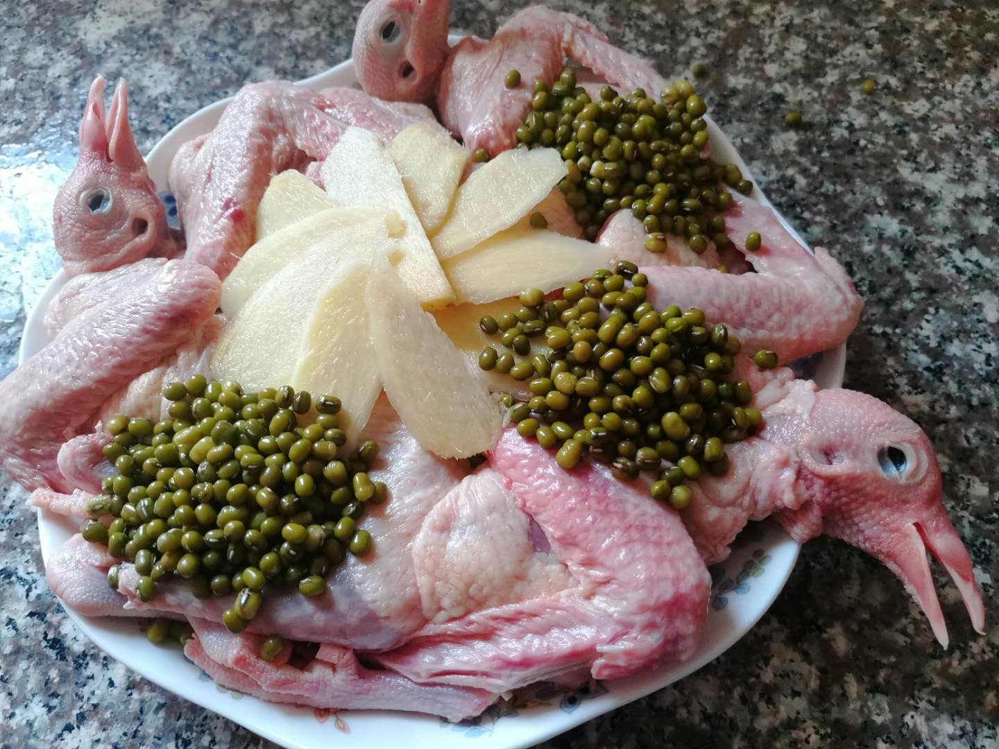材料:白鸽3只(5人份量),红枣8颗,绿豆150克,姜片8片。