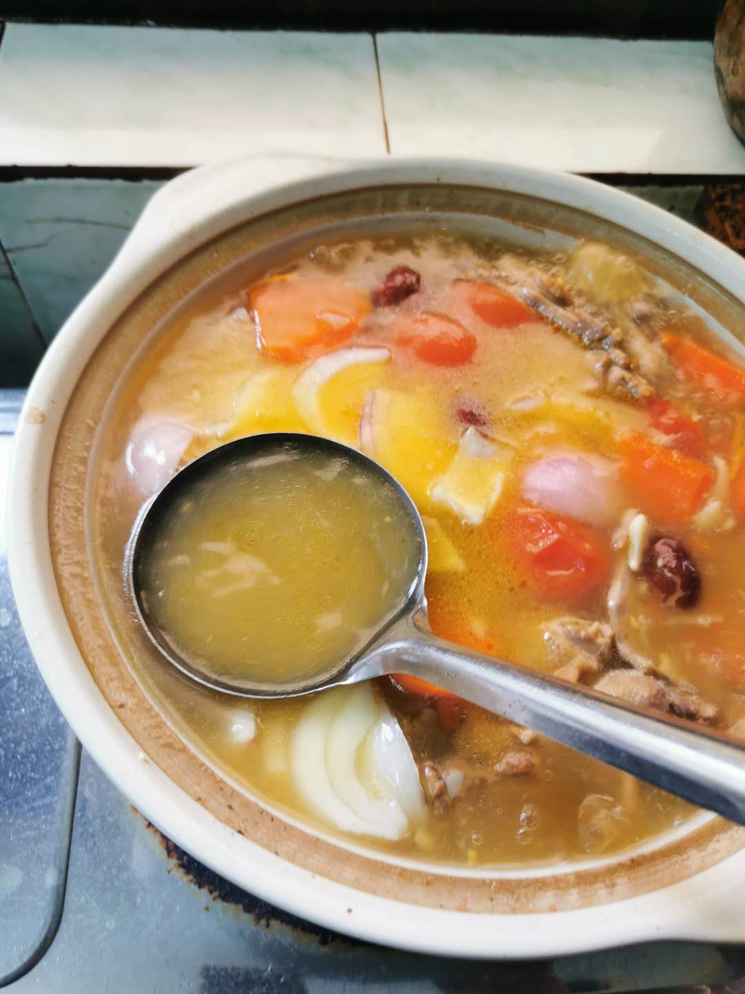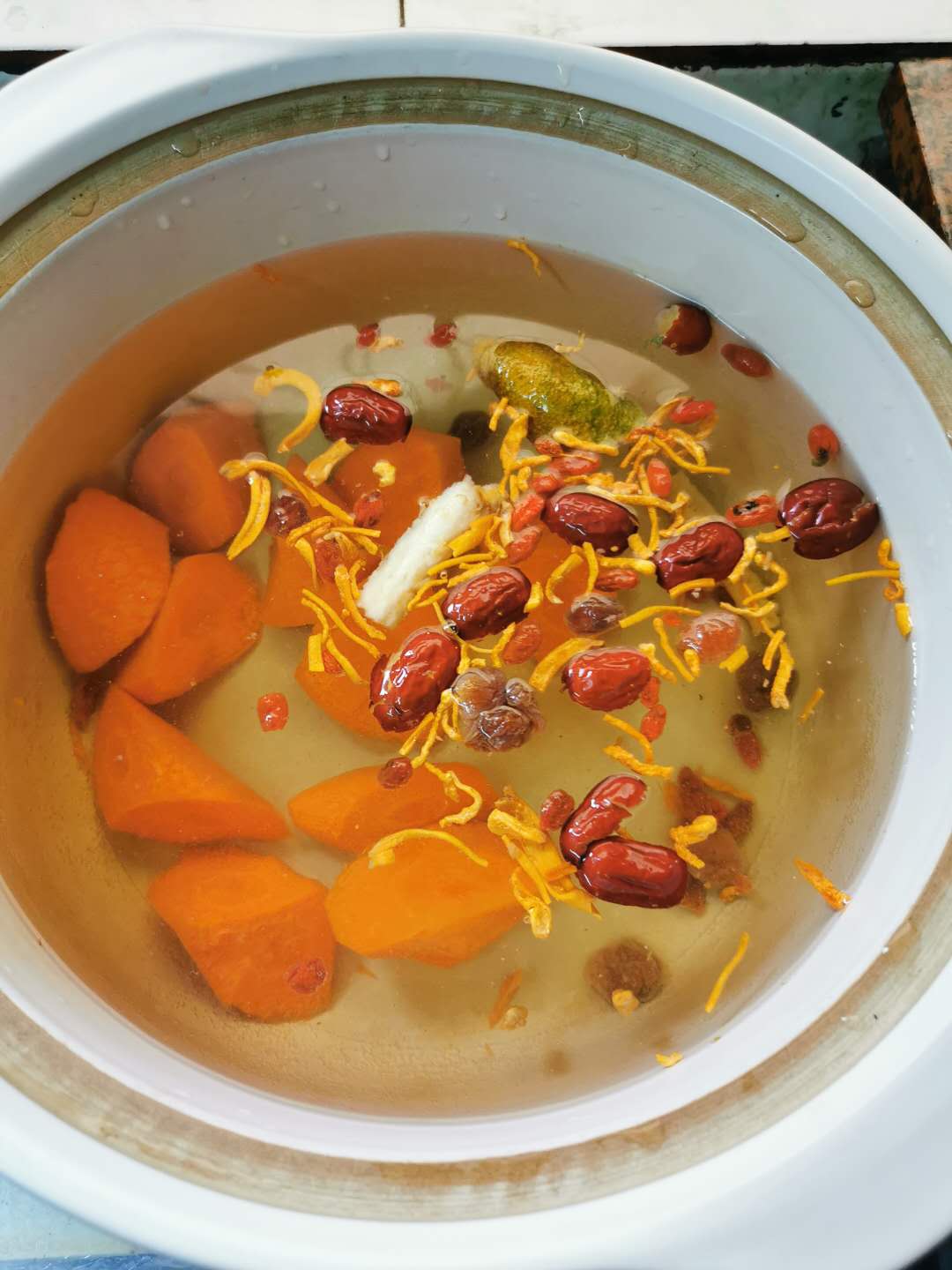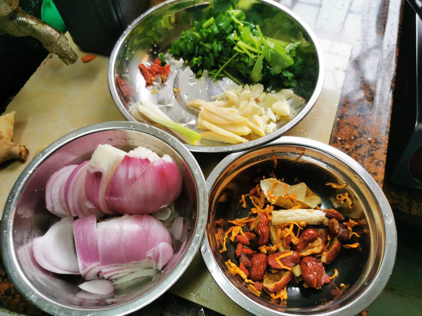 家庭做法:乳鸽2只,桂圆、红枣、枸杞、虫草花、沙参、果皮适量,土豆(适量需要),西红柿半斤,红萝卜1条,红葱头1个。