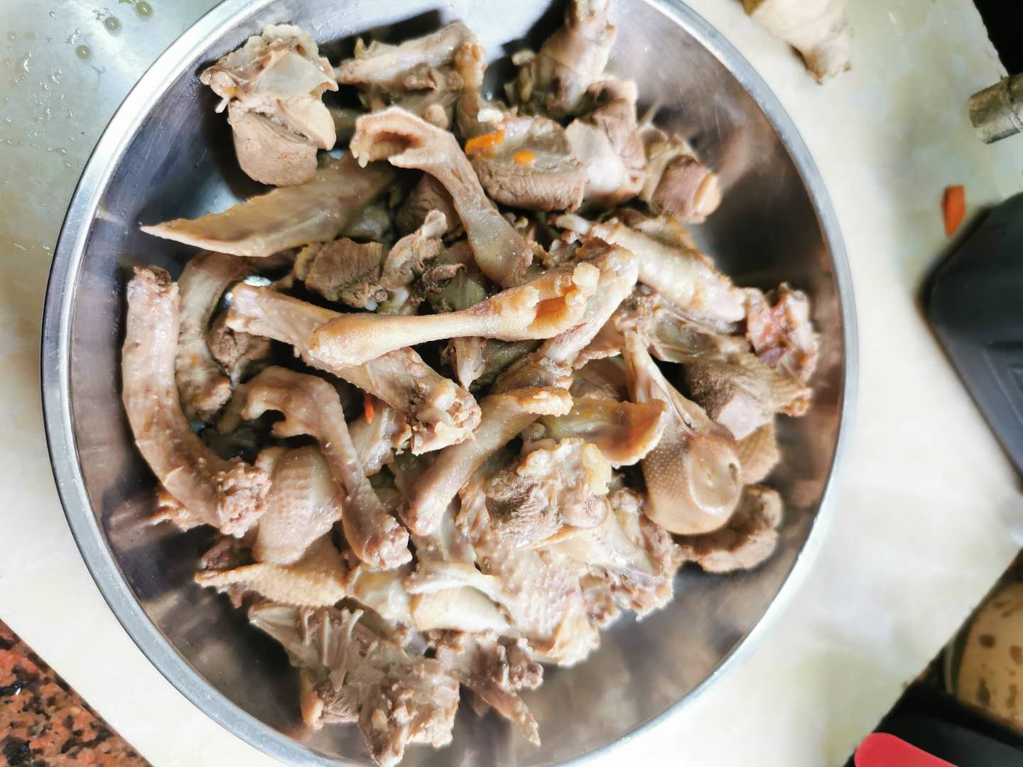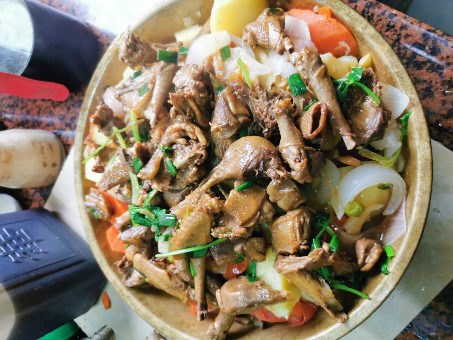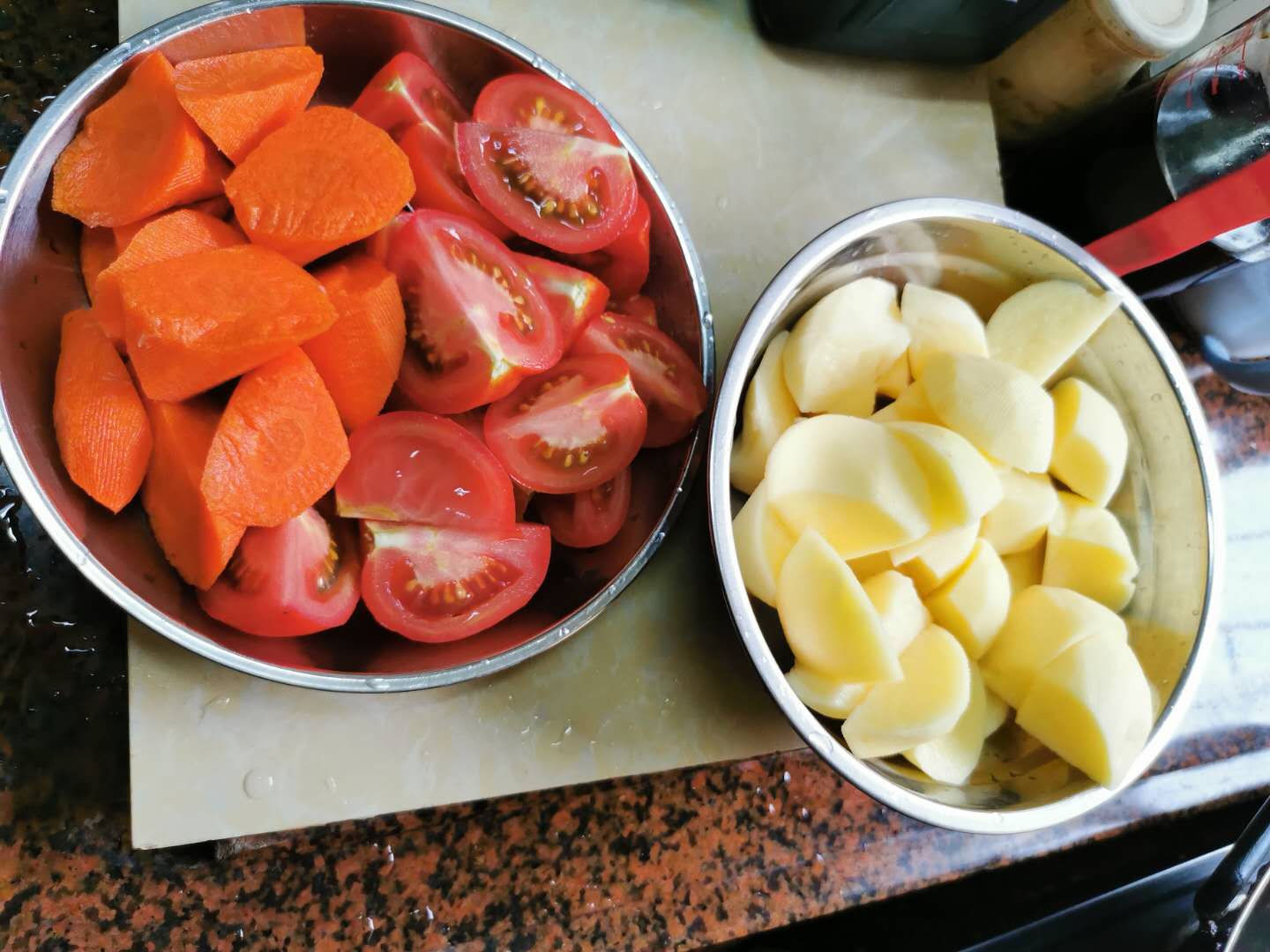 家庭做法:乳鸽2只,桂圆、红枣、枸杞、虫草花、沙参、果皮适量,土豆(适量需要),西红柿半斤,红萝卜1条,红葱头1个。