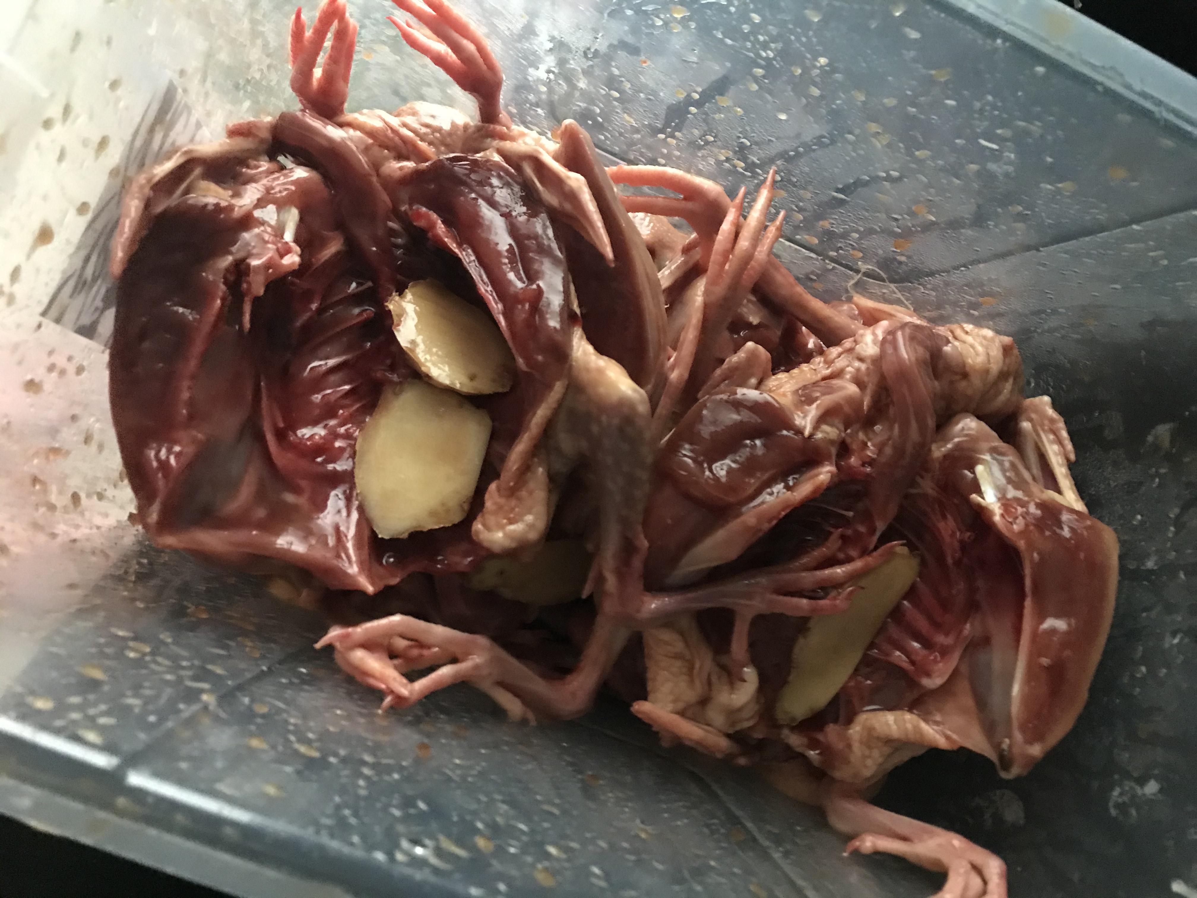 2、整理好的乳鸽,放入调味料腌制一晚:4勺酱油、4勺蚝油、4勺料酒、1勺糖、1勺盐、姜片适量