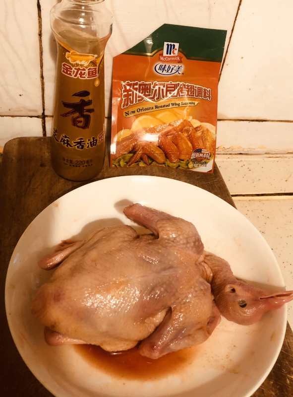 2.用少许芝麻油和新奥尔良烤翅调料搞拌好均匀涂抹在乳鸽和内腔上,腌制一至二小时左右。