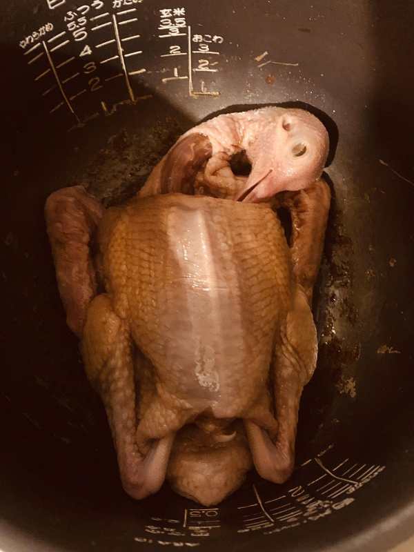 4.煮至中途要将乳鸽反转再盖上煮至电饭煲跳制。