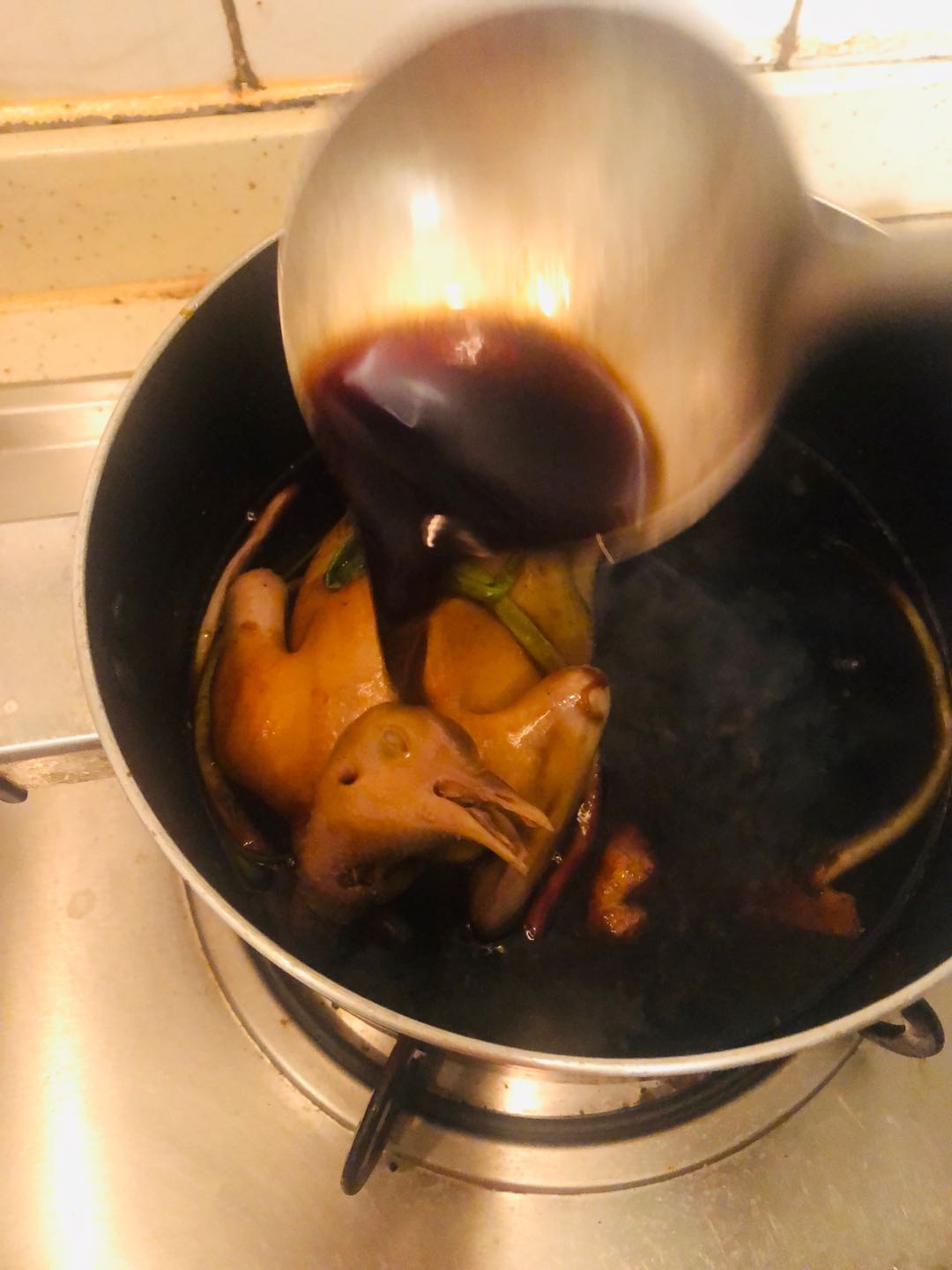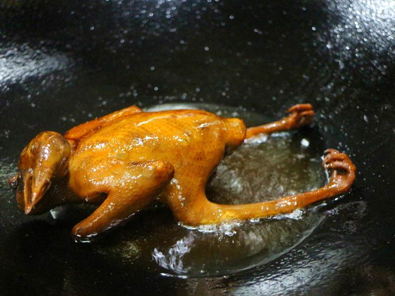 4、锅里烧热油,用汤勺舀油均匀淋到乳鸽上,直到乳鸽变成金黄色。