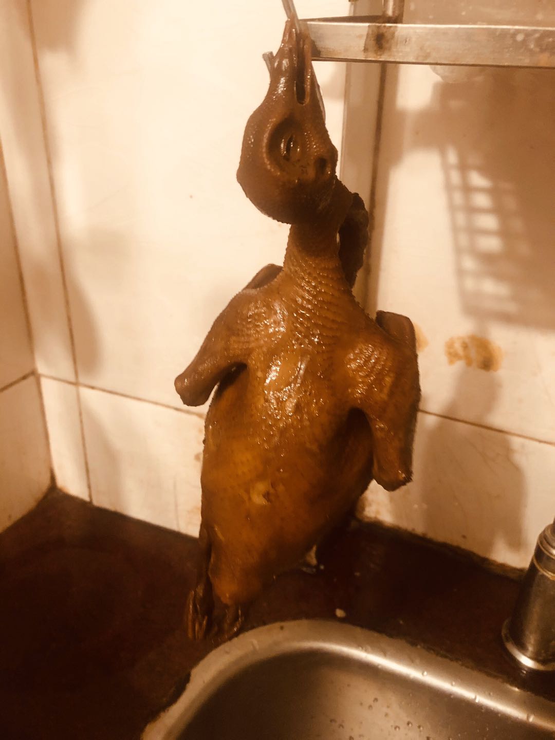 3、用一匙蜜芽糖、二匙醋、水调成脆皮水,均匀涂抹在乳鸽上,吊起凉干水份。